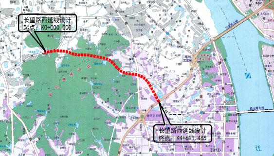 長望路西延線位于湘江新區(qū)范圍內,路線呈東西走向。道路西接黃金大道,往東沿谷山森林公園北側山體埡口,穿過龍湖湘風原著,往東接現(xiàn)狀金星北路,再向東南連接現(xiàn)狀西二環(huán),道路全長4.611KM,并對長望路(西二環(huán)-觀沙路)段進行了改擴建設計,長度0.611KM,金星路、黃金大道立交范圍內的主線及輔道進行改造。本標段范圍為K0+000-K1+520。其中包括跨線一座、下穿式矩形框架橋一座、地下人行通道一座,線路設計為城市主干路、設計車速60km/h。