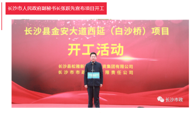 4月19日上午,長(zhǎng)沙縣金安大道(含白沙河橋)西延項(xiàng)目開工活動(dòng)隆重舉行。長(zhǎng)沙市人民政府副秘書長(zhǎng)張躍先,長(zhǎng)沙縣委副書記、縣長(zhǎng)、松雅湖生態(tài)新城建設(shè)指揮部指揮長(zhǎng)陳永高,松雅湖生態(tài)新城建設(shè)指揮部常務(wù)副指揮長(zhǎng)曹偉興,長(zhǎng)沙市市政工程有限責(zé)任公司董事長(zhǎng)陳懷柏出席活動(dòng)。長(zhǎng)沙縣松雅湖生態(tài)新城發(fā)展中心書記羅衛(wèi)滋主持開工活動(dòng)。